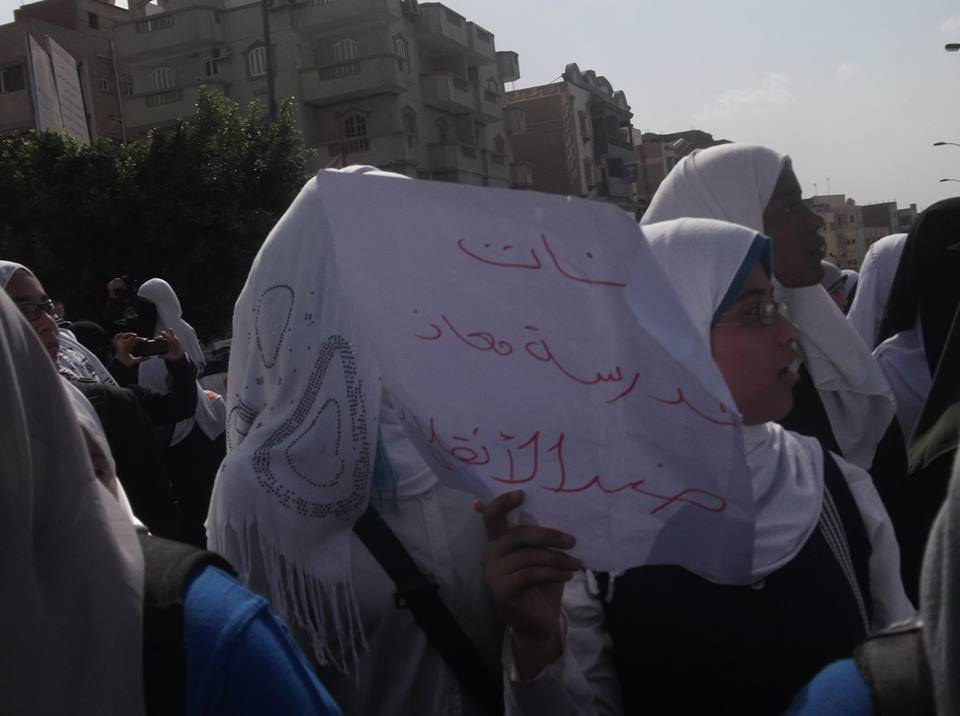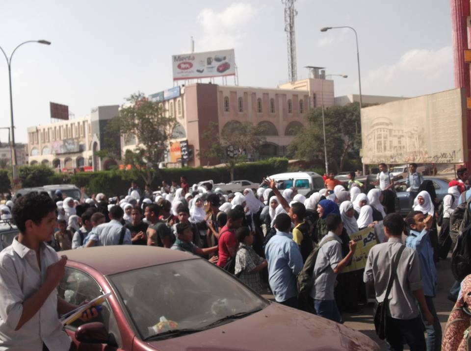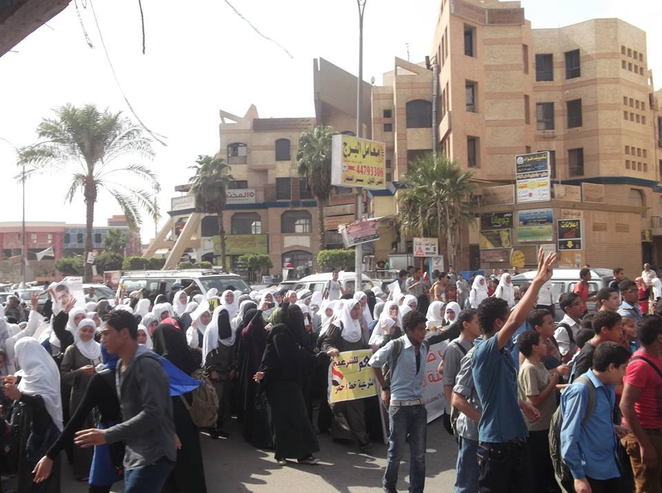 وقد قوبلت المسيرة بسيارة وأفراد الشرطة لتفريق الطلاب المتظاهرين وطاردتهم داخل شوارع محلية (٨) في مدينة العبور.