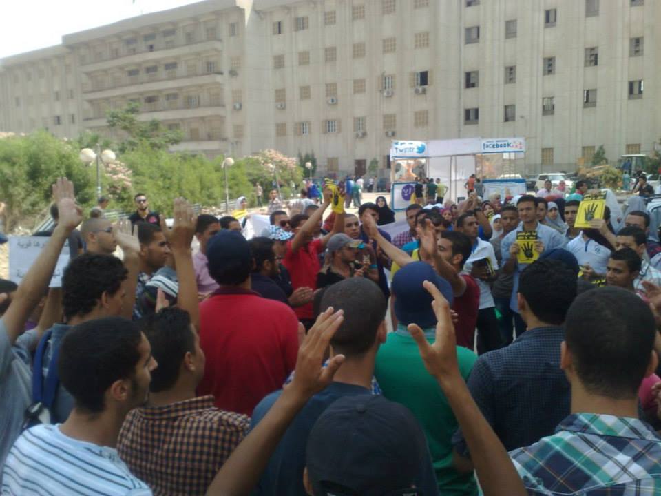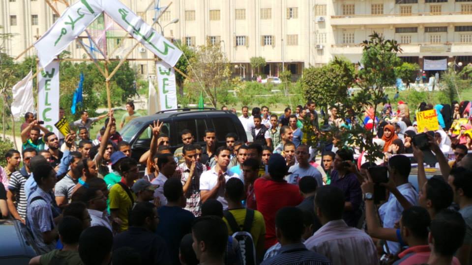 حيث احتشد المئات من الطلاب المؤيدين للشرعية والمنددين بالانقلاب العسكرى وما آلت اليه احوال البلاد وبالاخص حال الجامعة التى أصبح حرمها ماهو الا ساحة حرب واعتقال على حد قولهم تعليقا على قرار منح الضبطية القضائية بالجامعات ..