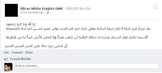 نعى أولتراس "الوايتس نايتس" أحد أعضائه الذي توفي منذ قليل متأثرا بجراحه بعد اعتداء قوات أمن الانقلاب عليه يوم الخميس الماضي أمام نادي الزمالك ، وذلك خلال تظاهرة لـ الوايتس نايتس" للمطالبة برحيل مجلس إدارة النادي ، وقامت قوات أمن الانقلاب حينئذ بمهاجمة التظاهرة بالطلق الحي والخرطوش والغاز المسيل للدموع .