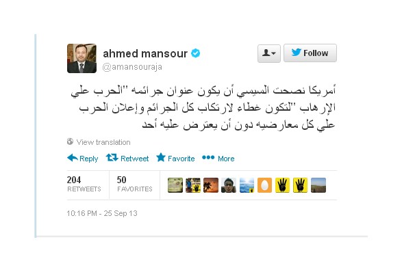 قال الإعلامي أحمد منصور-مقدم البرامج بقناة الجزيرة-أمريكا نصحت السيسي أن يكون عنوان جرائمه "الحرب علي الإرهاب "لتكون غطاء لارتكاب كل الجرائم وإعلان الحرب علي كل معارضيه دون أن يعترض عليه مباشر