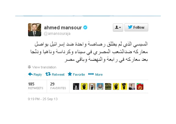 وأضاف منصور في تغريدات علي صفحته علي موقع تويتر:- "السيسي الذي لم يطلق رصاصة واحدة ضد إسرائيل يواصل معاركه ضدالشعب المصري في سيناء وكرداسة وناهيا ودلجا بعد معاركه في رابعة والنهضة وباقي مصر.