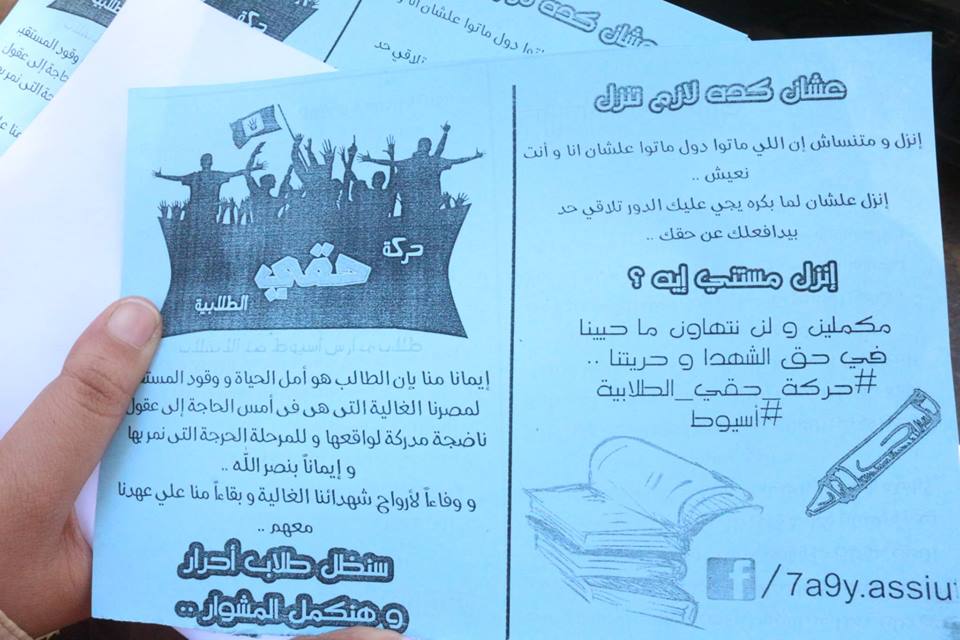 في فاعلية جديدة, نظمت حركة " حقي الطلابية " وقفة احتجاجية اليوم الخميس تحت عنوان " دب بكنكة تولع نار بينا و بينهم دم و تار " , حيث بدأت الوقفة بعد إنتهاء اليوم الدراسي في الواحدة ظهراً أمام مسجد خشبة في شارع الجمهورية بمدينة أسيوط.