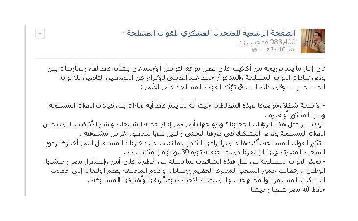 نفي المتحدث العسكري باسم الجيش عقد لقاء ومفاوضات بين بعض قيادات القوات المسلحة ود.أحمد عبد العاطى -مدير مكتب الرئيس الشرعي محمد مرسي- للإفراج عن المعتقلين التابعين للإخوان المسلمين.