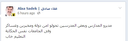 وكتب صادق عبر حسابه على موقع التواصل الاجتماعي فيسبوك اليوم الأحد: " مديرو المدارس وبعض المدرسين تحولوا من دولة ومخبرين وعساكر وفى الجامعات نفس الحكاية التعليم خاب".