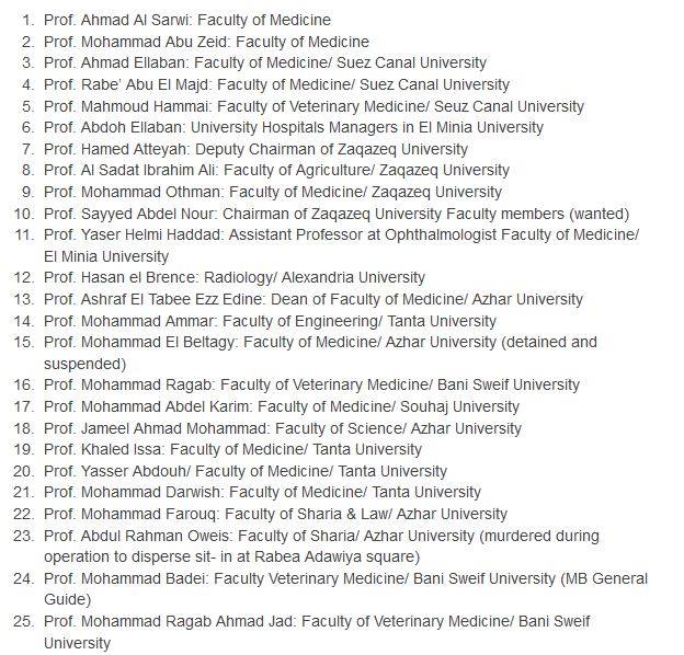 ونشرت الصحيفة نقلًا عن نشطاء مصريين قائمة تضم 70 اسم من أساتذة الجامعات الذين تم إلقاء القبض عليهم من قبل سلطات الانقلاب العسكري مشيرة أن هذه القائمة لا تضمن أسماء الأساتذة الذين قتلوا أو الذين تم فصلهم عن الجامعات بشكل تعسفي.
