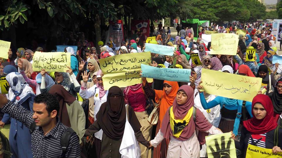 قام عدد كبير من طلاب وطالبات كلية طب القصر العيني وطب اسنان بجامعة القاهرة بمسيرة احتجاجية للتنديد بحكم العسكر .