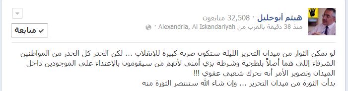 وأضاف في تدوينة له علي صفحته الشخصية علي موقع "الفيسبوك" اليوم (الثلاثاء):- "لكن الحذر كل الحذر من المواطنين الشرفاء إللي هما أصلاً بلطجية وشرطة بزي أمني لأنهم من سيقومون بالإعتداء علي الموجودين داخل الميدان وتصوير الأمر أنه نحرك شعبي عفوي !!! ".