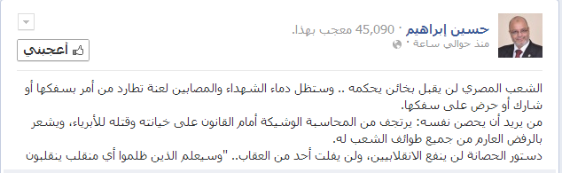 وأضاف إبراهيم في تدوينة له على موقع التواصل الاجتماعي "فيس بوك" أن "الشعب المصري لن يقبل بخائن يحكمه .. وستظل دماء الشهداء والمصابين لعنة تطارد من أمر بسفكها أو شارك أو حرض على سفكها."