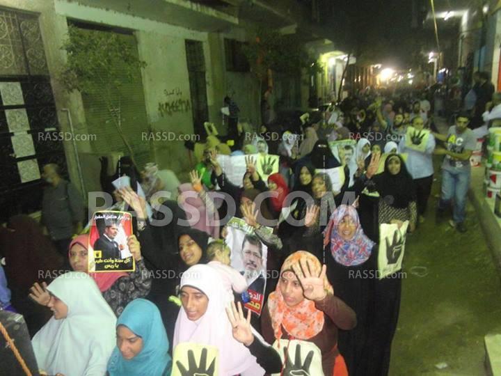 ورفع المشاركون علامة النصر رابعة، وصورة الرئيس محمد مرسي، كما أحدث عدد من الرجال المشاركون في المسيرة أصوات من الحلل للفت الانتباه .