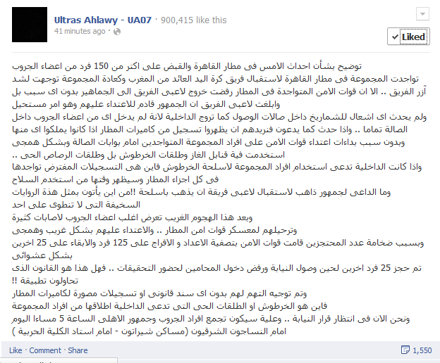 نفي فريق ألتراس أهلاوي عبر صفحتهم الرسمية علي الفيسبوك الرواية الرمسية بخصوص ما حدث أمس بمطار القاهرة ونفوا أن تكون مجموعتهم قد قامت بأي أعمال شغب كما أدعت وزارة الداخلية حسبما يقولون.