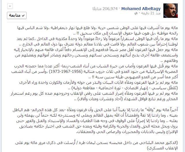 وقال البلتاجي في نص رسالته:- "مائة يوم ما رأى فيها الوطن استقراراً مزعوماً ولا رخاءً موعوداً ولا وحدةً مكذوبة في الداخل ،كما لم يعد لوطننا إحتراماً بين شعوب العالم ،ولا قامت في بلادنا معالم دولة تعترف بها دول العالم في الخارج".