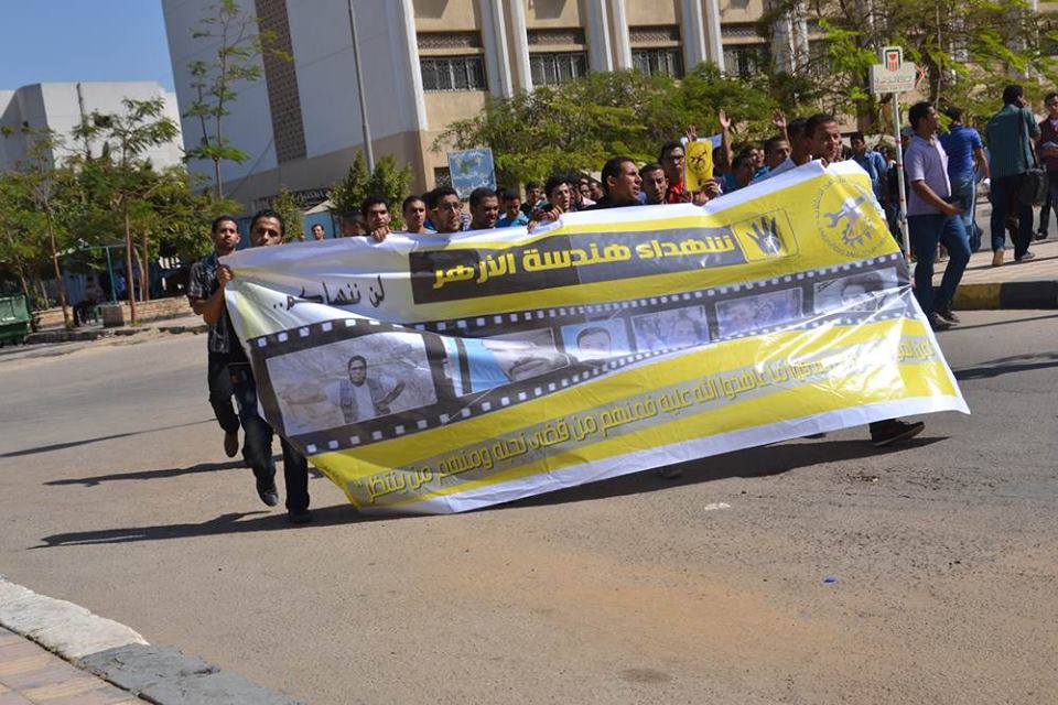 كما قام الطلاب بإشعال الشماريخ مرددين الاغانى الثورية وهتافات منها" يسقط يسقط شيخ الازهر"و" السيسى قاتل.. السيسى خائن"و" رابعة..رابعة"، وانضم الى الطلاب مسيرة من طلاب كلية الهندسة حاملين لافتة كبيرة عليها صور زملائهم الذين استشهدوا فى الاحداث التى اعقبت الإنفلاب على الرئيس محمد مرسى.