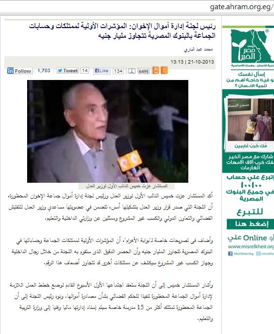 أكد المستشار عزت خميس مساعد أول وزير العدل عدم صحة الخبر الذى نسبته إليه بوابة الاهرام من أن المؤشرات الاولية لممتلكات الجماعة وحساباتها فى البنوك المصرية تتجاوز المليار جنيه , وأن الحصر الدقيق الذى ستقوم به اللجنة من خلال رجال الداخلية وجهاز الكشف غير المشروع سيظهر ممتلكات أخرى قد تتجاوز أضعاف هذا الرقم.