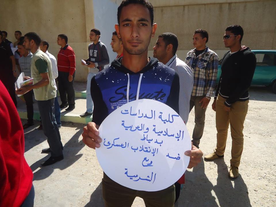 فيما قام الطلاب المعارضون للإنقلاب بكلية الدراسات الإسلاميه والعربيه بدمياط الجديده بعمل وقفه تظاهريه لرفض الإنقلاب العسكري بالكليه ونددو فيها بحكم العسكر ومجازره التي كان من نتائجها أن استشهد زميلهم الطالب صهيب البسطويسي في فض اعتصام رابعه العدويه.