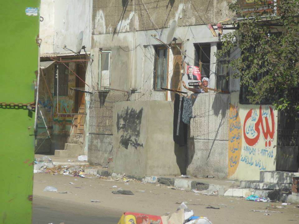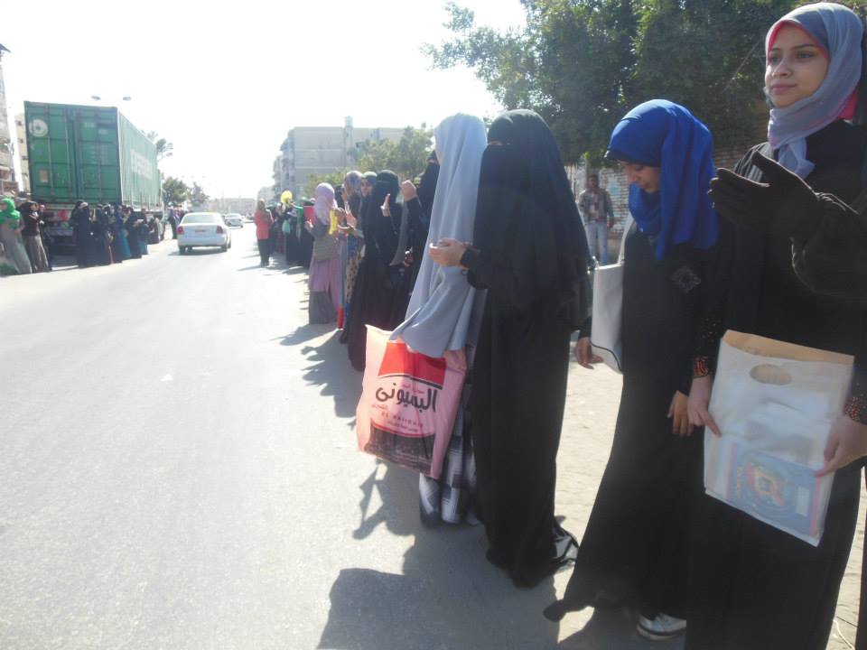 رفع الطالبات اثناء السلسلة اعلام مصر وصور الرئيس المنتخب محمد مرسي وشعر رابعة العدوية رمز الصمود.