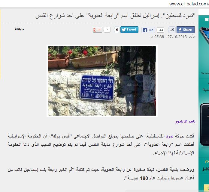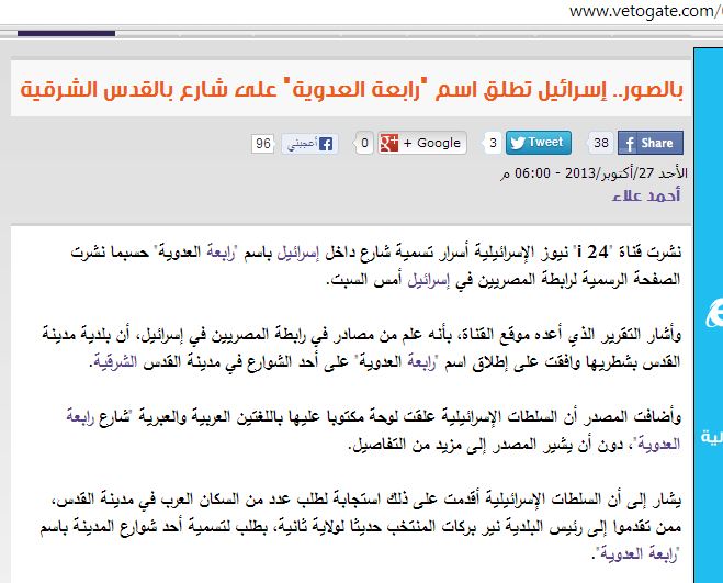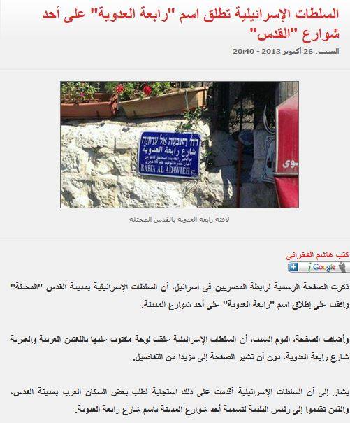 حيث قامت عدد من المواقع الاخبارية المصرية خلال اليومين الماضيين بنشر ما يفيد أن حكومة الكيان الصهيوني قد أطلقت اسم “رابعة العدوية” على أحد شوارع مدينة القدس ، وروجت تلك المواقع أن ذلك يأتي في إطار التعاون بين الكيان الصهيوني وجماعة الإخوان.