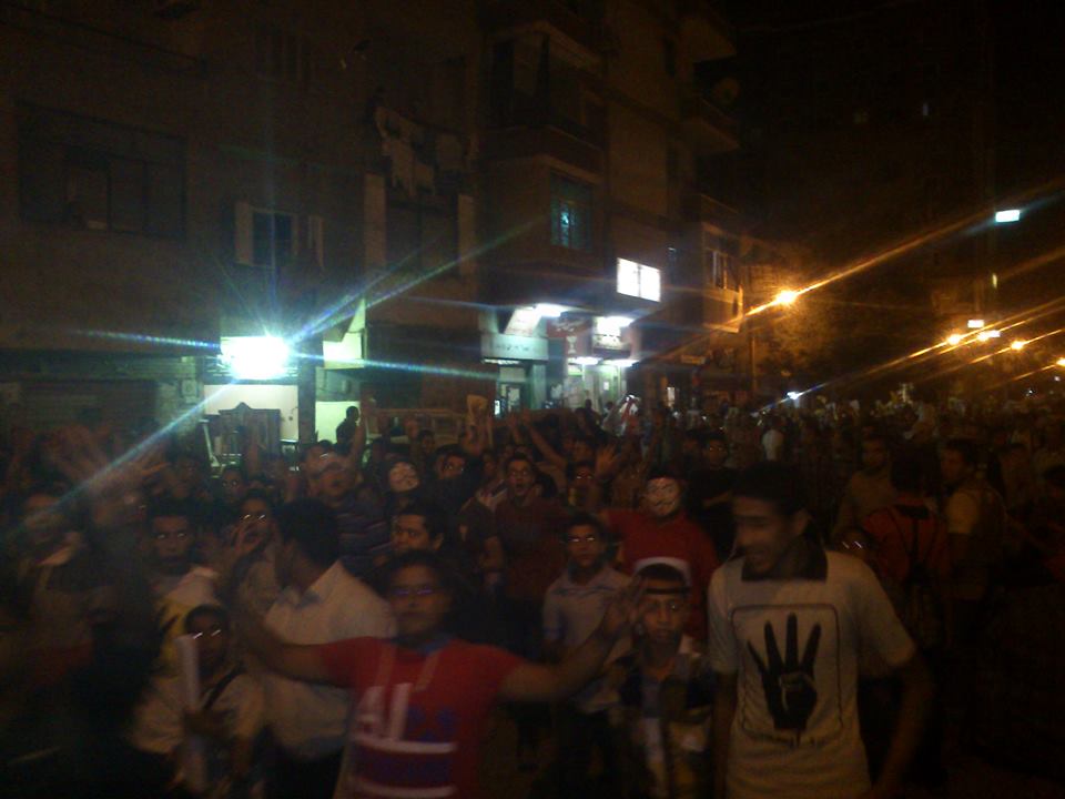 ودعا المشاركون في المسيرة الأهالى الى الانضمام إلى التظاهر السلمي غدا لإسقاط الانقلاب العسكرى حيث رفع المتظاهرون شارات رابعة العدوية.وأشعل اولتراس نهضاوى حماس المتظاهرين بالهتافات والصيحات والألعاب النارية.