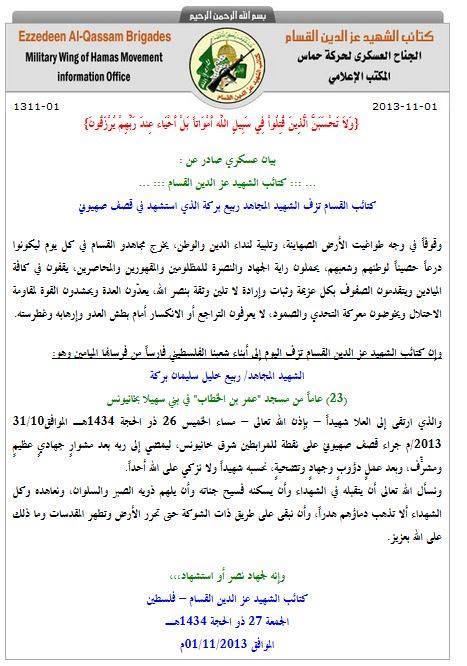 وقالت الحركة في بيان لها علي موقعها الرسمي: "إن كتائب الشهيد عز الدين القسام تزف اليوم إلى أبناء شعبنا الفلسطيني فارساً من فرسانها الميامين وهو:الشهيد المجاهد/ ربيع خليل سليمان بركة (23) عاماً من مسجد "عمر بن الخطاب" في بني سهيلا بخانيونس، والذي ارتقى إلى العلا شهيداً – بإذن الله تعالى – مساء الخميس 26 ذو الحجة 1434هـ الموافق31/10/2013م جراء قصف صهيوني على نقطة للمرابطين شرق خانيونس، ليمضي إلى ربه بعد مشوارٍ جهاديٍ عظيمٍ ومشرّفٍ، وبعد عملٍ دؤوبٍ وجهادٍ وتضحيةٍ، نحسبه شهيداً ولا نزكي على الله أحداً".