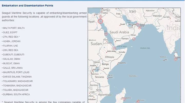 و يوضح تقرير المنظمة العربية لحقوق الانسان و كذلك موقع الشركة قبل حجبه أهم مناطق عمليات الشركة في العالم العربي بترخيص من السلطات المحلية هم الإمارات العربية المتحدة في إمارة الفجيرة و مصر في قناة السويس وعدة نقاط في البحر الأحمر وتُعتبر الشركة أنها من بين الشركات القلائل المسموح لها النزول في جزيرة تيران الخاضعة للادارة المصرية بكامل اسلحتها فضلا عن دول سيريلانكا و جنوب افريقيا وتنزانيا .