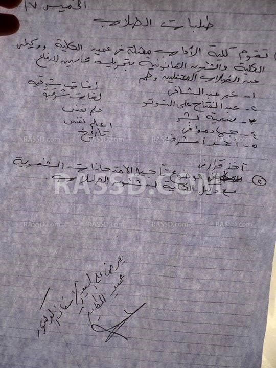 ورقة بمطالب الطلاب التي قام وكيل الكلية بالتوقيع عليها