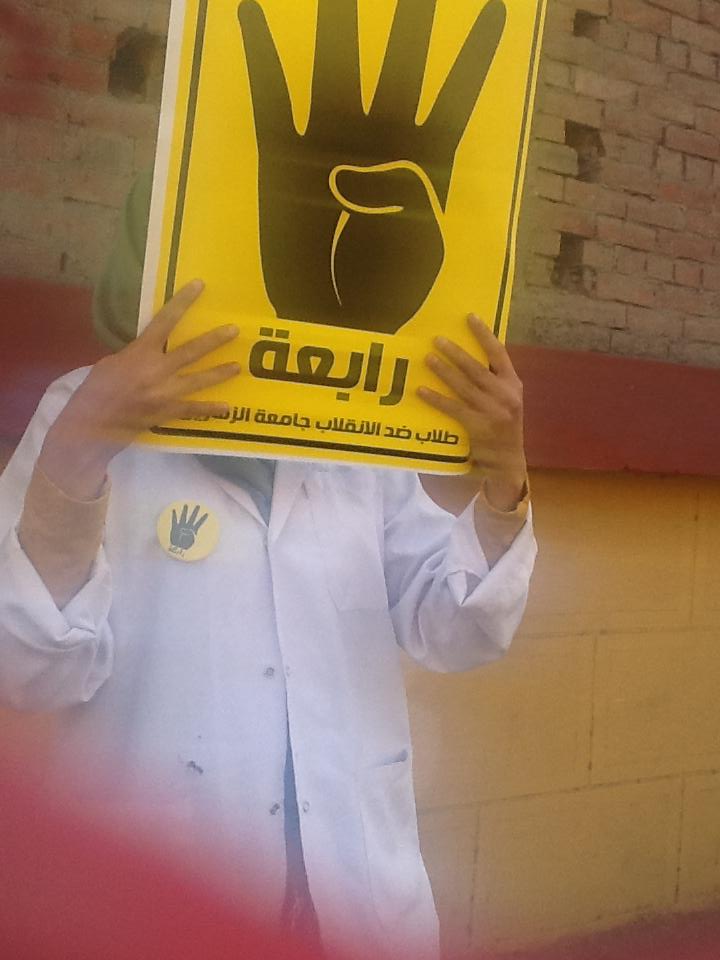 تجمع المئات من طلاب ضد الانقلاب في وقفه احتجاجيه امام كلية حاسبات ومعلومات المنوفيه رافيعن شاره رابعه العدويه ومرددين الكثيرمن الهتافات التي تطالب ياسقاط الانقلاب وعودة الشرعية .