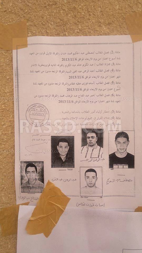 صورة للقرارات التي اتخذتها أكاديمية الشروق ضد بعض الطلاب التي شاركت في الوقفات ضد العسكر، و قاموا بوضع صورهم على البوابات الرئيسية
