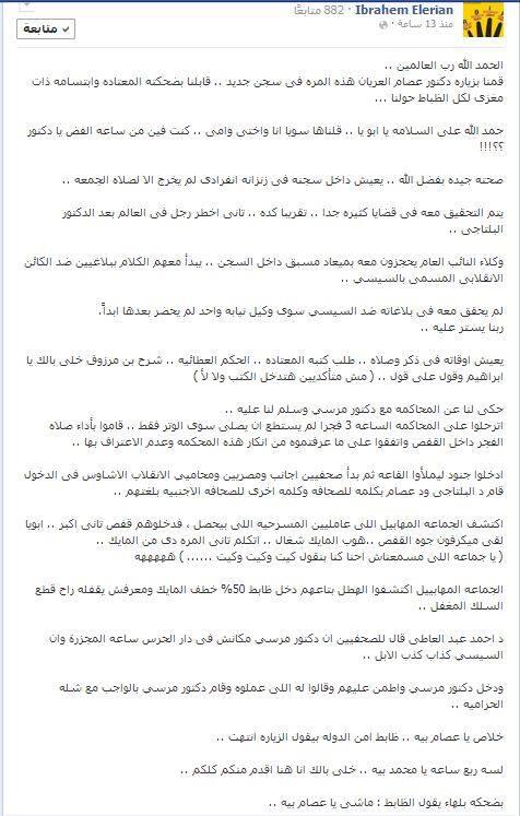 وبشأن يوم محاكته مع 13 من قيادات الإخوان، قال نجل العريان"اترحلوا على المحاكمة الساعه 3 فجرا لم يستطع ان يصلى سوى الوتر فقط .. قاموا بأداء صلاه الفجر داخل القفص واتفقوا على ما عرفتموه من انكار هذه المحكمة وعدم الاعتراف بها ..ادخلوا جنود ليملأوا القاعه ثم بدأ صحفيين أجانب ومصريين ومحاميي الانقلاب فى الدخول قام د البلتاجى ود عصام بكلمه للصحافة وكلمه أخرى للصحافة الأجنبيه بلغتهم"، مشيرًا إلي أن دكتور أحمد عبد العاطى، مدير مكتب الرئيس محمد مرسي، قال للصحفيين أن مرسي لم يكن بدار الحرس الجمهوري يوم مذبحة الفجر كما قال السيسي.