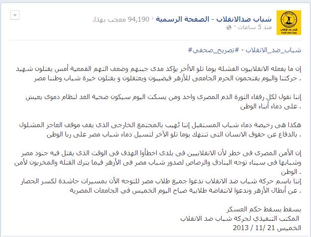 واختتمت" إننا باسم حركة شباب ضد الانقلاب ندعوا جميع طلاب مصر للتوجه الأن بمسيرات حاشدة لكسر الحصار عن أبطال الأزهر وندعوا لانتفاضة طلابية صباح اليوم الخميس في الجامعات المصرية. يسقط يسقط حكم العسكر. "