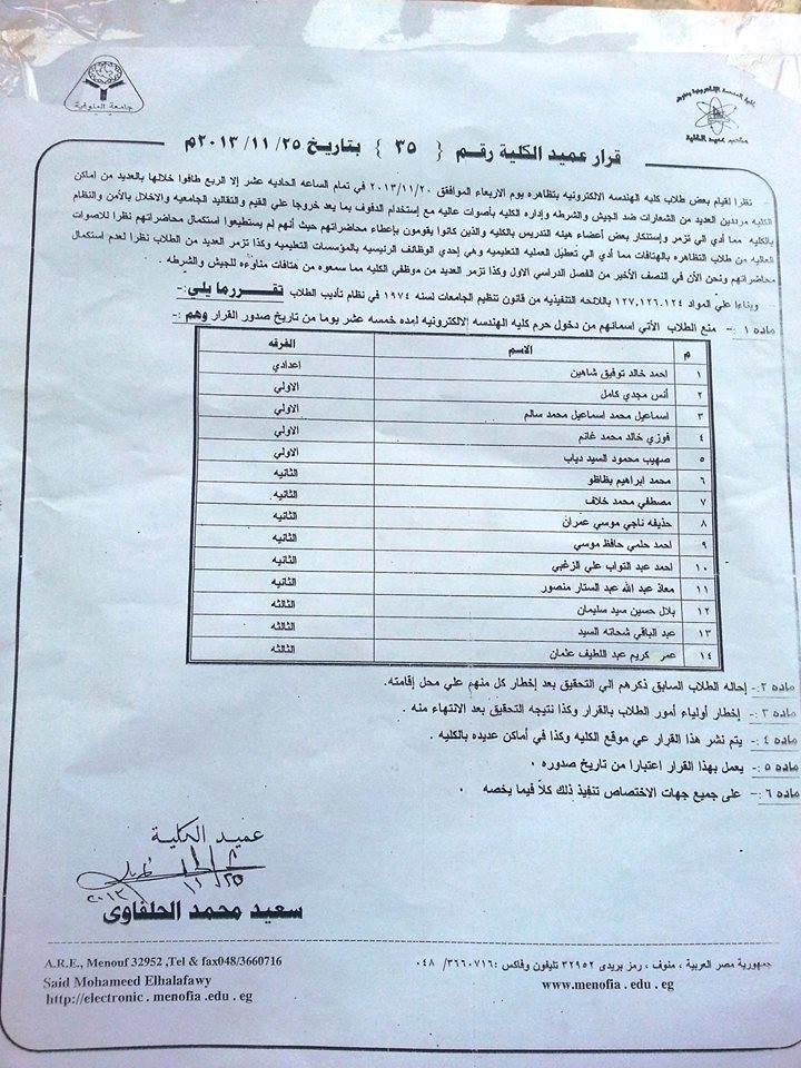 أصد الدكتور سعيد محمد الحلفاوى عميد كلية الهندسة الالكترونية بمنوف بمحافظة المنوفية  اليوم الاثنين  قرار بفصل 14 طالب من حركة طلاب ضد الانقلاب 15 يوما وذلك لتنظيمهم مسيرة فى ذكرى مرور 100يوم على فض اعتصامى رابعة والنهضة .