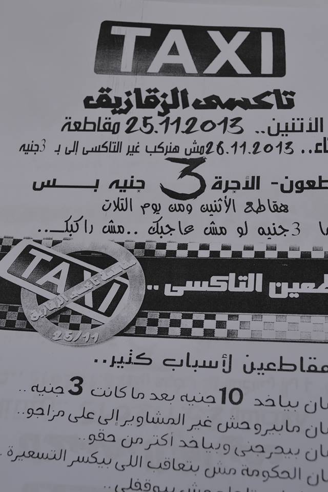 نظم مجموعة من الشباب داخل جامعة الزقازيق حملة للتوعية تهدف إلي مقاطعة التاكسى لاستغلال السائقين وفرض اجره كبيره على المواطنين وطالبوا بتخفيضها وعودتها مرة أخري ل3جنيهات كما كان سابقا .