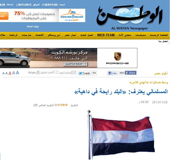 نشرت صحيفة الوطن الكويتية -المؤيدة للانقلاب بمصر- تصريحاً اليوم للمتحدث باسم رئاسة الانقلاب أحمد المسلماني قال فيه أن "البلد رايحة في داهية" لو استمر الوضع على ما هو عليه، ما اثار فزع واستغراب أصدقائه ومستمعيه.