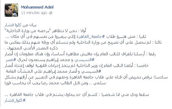 يذكر أن الناشط محمد عادل نفى تصريح مسئول المركز الاعلامى بوزارة الداخلية على صفحته الشخصية على موقع التواصل الاجتماعي" فيس بوك" , حيث قال نحن لا نتظاهر "برخصه" من وزارة الداخلية ولن  نبيع طلاب جامعة القاهرة الذين يعبرون عن أنفسهم في أي مكان ولم نحصل علي أي تصريح من وزارة الداخلية ولم نتسلم أي ورقة منهم بذلك بعكس ما ذكره المصدر الأمني المجهول .