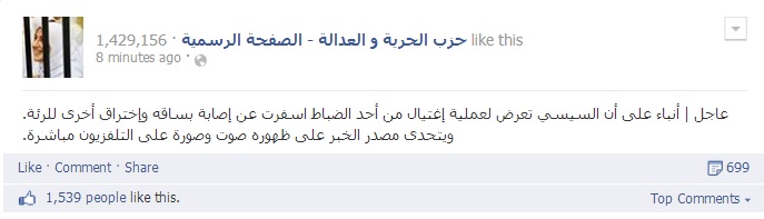 قالت الصفحة الرسمية لحزب الحرية والعدالة أن الفريق عبد الفتاح السيسي تعرض لمحاولة اغتيال اليوم وأنه اصيبب اصابة خطيرة وأنها تتحدى الفريق السيسي ان يظهر وسط الجماهير على الهواء ليكذب الاشاعة.