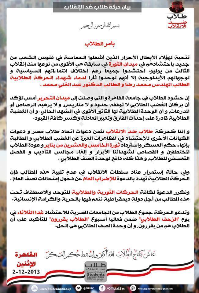 و أضاف البيان إننا كحركة طلاب ضد الإنقلاب نثمن دعوات اتحاد طلاب مصر و دعوات الكيانات الأخرى للإحتشاد في المظاهرات المعبرة عن الغضب الطلابي و المطالبة بإنهاء حكم العسكر واسترداد ثورة الخامس والعشرين من يناير و عودة الطلاب المختطفين و القصاص لشهدائنا الأبرار و إلغاء مجالس التأديب و الفصل التعسفي للطلاب, و هذا كله دافع لوحدة الصف الطلابي .