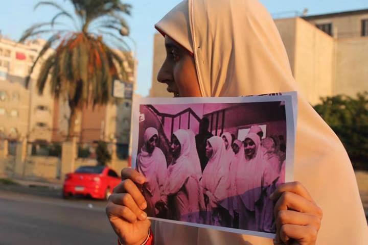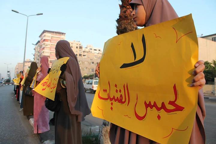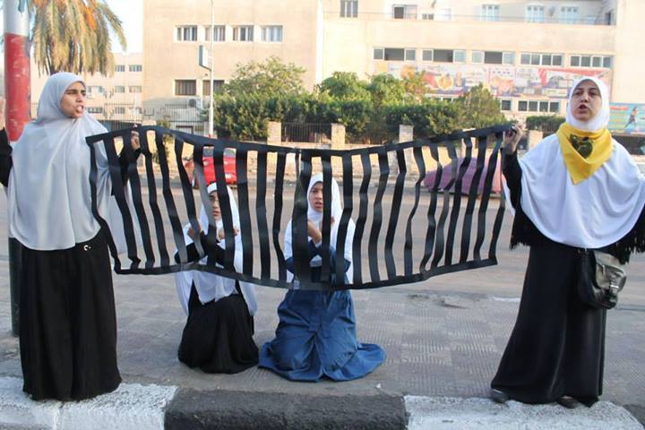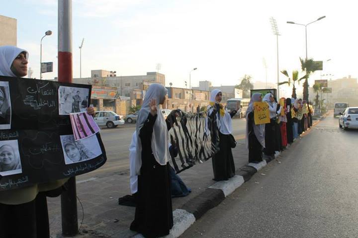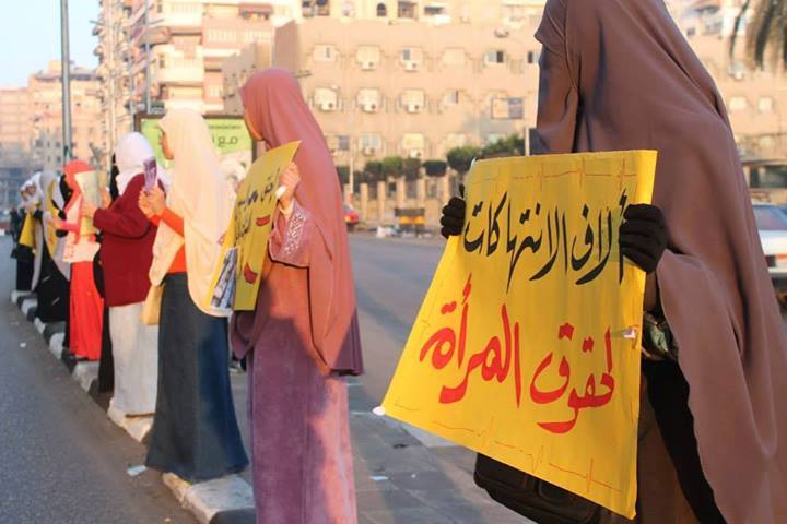 وحمل المشاركون لافتات كتب على بعضها :"لا لحبس الفتيات"و "احلق شنبك والبس جيبة حطوا بناتنا في التخشيبة"و"ألاف الانتهاكات لحقوق المرأة"، كما رفعوا شارة رابعة العدوية، وسط تفاعل كبير للمارة وسائقي السيارات.