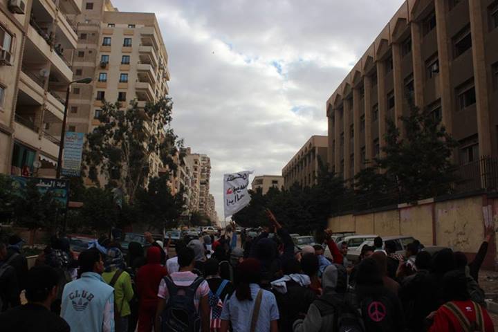 وردد الطلاب هتافات "إحنا الطلبة ودى كلمتنا .. حكم العسكر على جثتنا" "لا دراسة ولاتدريس حتى عودة الرئيس" ، ورفع المشاركون شارة رابعة العدوية وصورا لشهداء فض اعتصامى رابعة والنهضة .