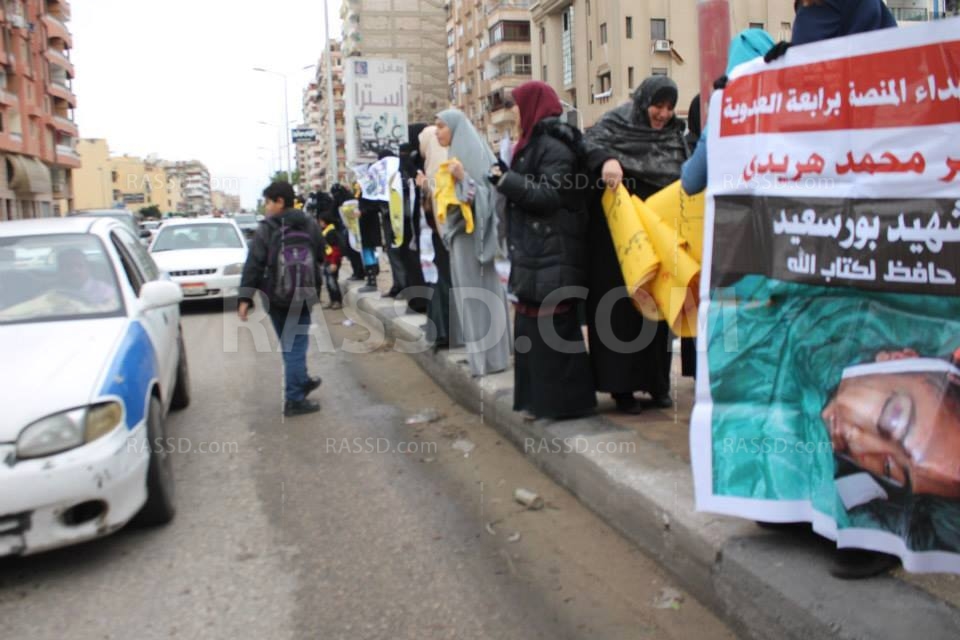 رفعت المشاركات في الوقفة شعارات رابعة العدوية و صور شهداء و معتقلين بورسعيد ولاقت السلسله البشرية تفاعل كبير من المارة