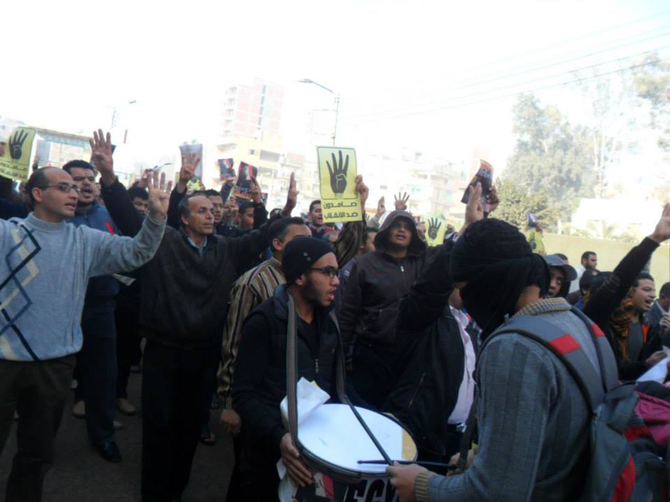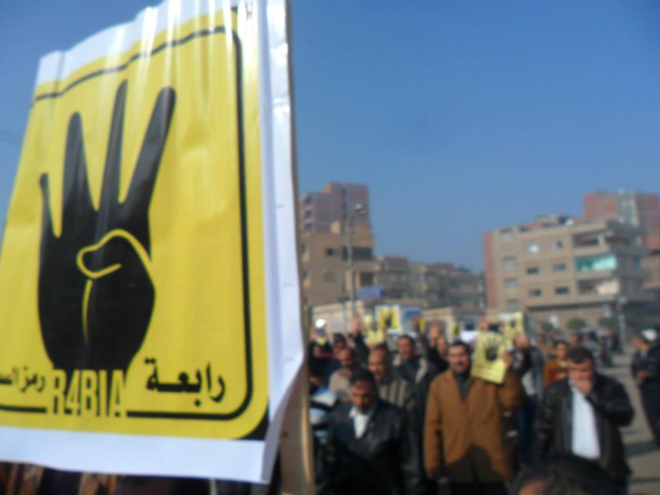 ورفع المشاركون شارات رابعة العدوية ولافتات للشهداء والمعتقلين وررد المشاركون هتافا "ياللى بتسأل اية القصة قتلوا اخويا وحرقوا الجثة " "يسقط يسقط حكم العسكر " "هنقاطع الدستور " وطافت المسيرة معظم شوارع المدينة .