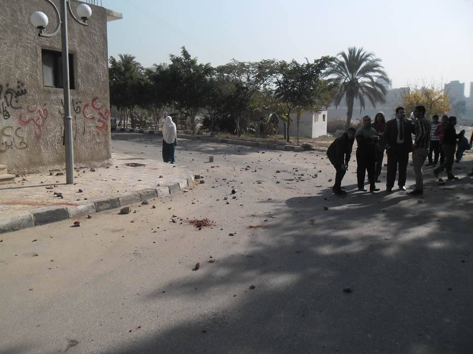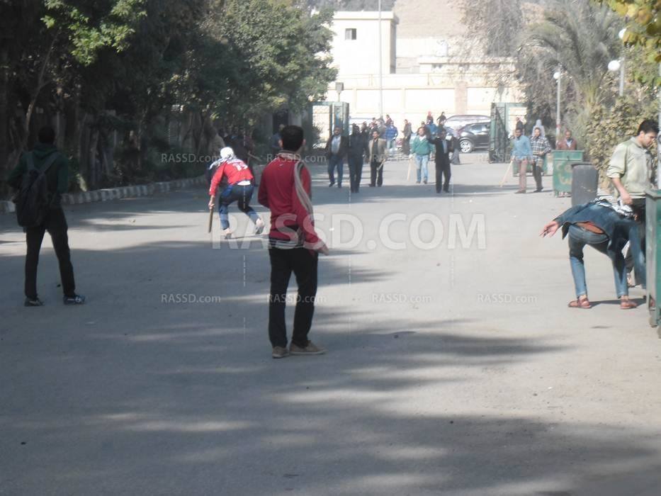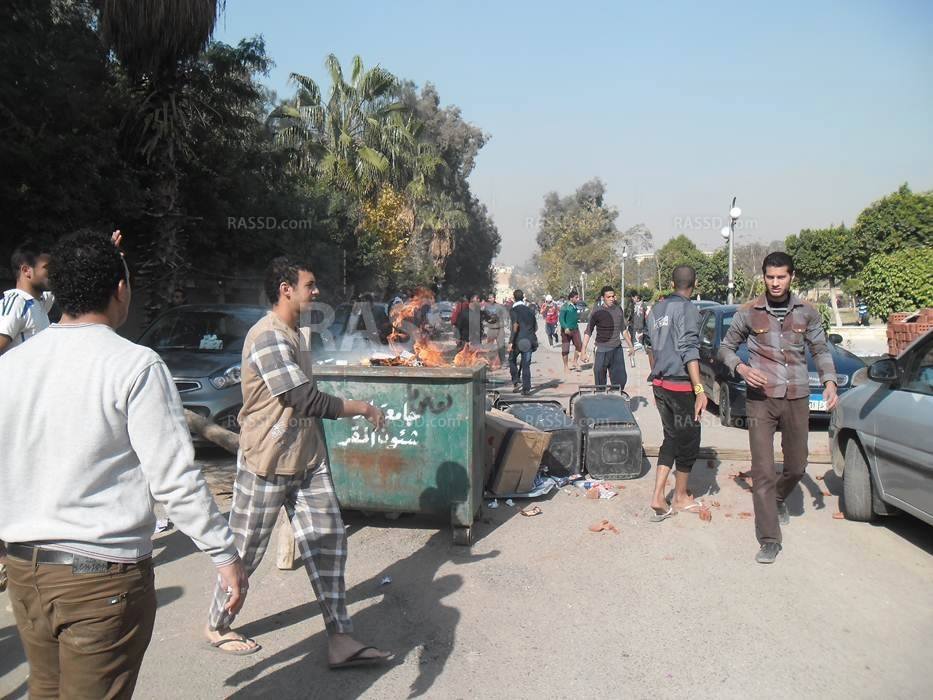 وقام الطلاب بإشعال النيران فى القمامة والأخشاب لتفادى رائحة الغاز المسيل للدموع، وعاودن قوات الأمن تمركزها أمام بوابة الصيدلة ومعها عدد من البلطجية والعمال الإداريين ومعهم الشوم والعصى وحاصرو الجامعة .