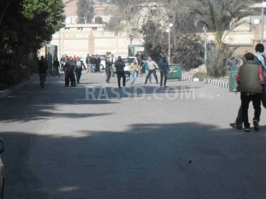 من جانبهم اقتحم الأمن الجامعه وأطلق قنابل الغاز على الطالبات المتظاهرات، وقام طلاب المدينة الجامعية بتسلق السور الذى يفصل بينهم والتصدى للأمن الإدارى الذى قام بالتعدى على الطالبات بعد انسحاب الشرطة .