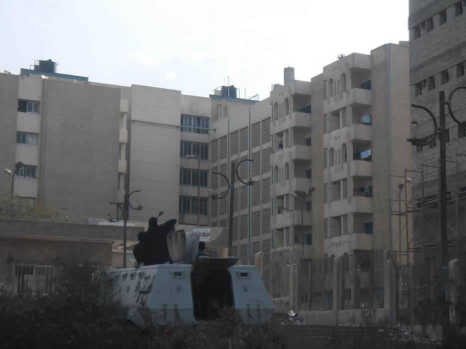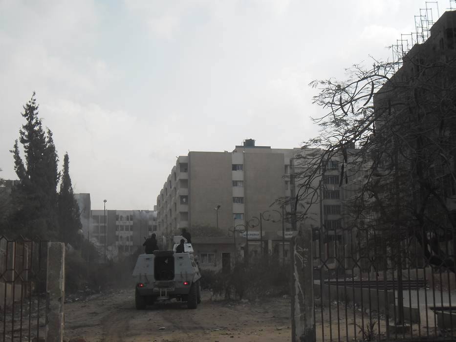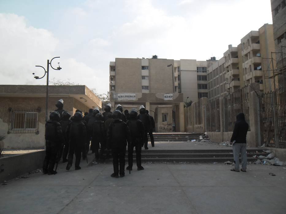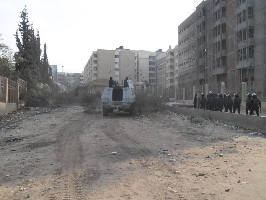 ويقع الباب الخلفى للمدينة الجامعية خلف الجامعة مباشرة وملاصق للمبانى السكنية ويتم ضرب الغاز داخلها وأدى ذلك إلى وصول الغاز داخل الغرف وسط اخنتاقات وتستخدم قوات الامن مدرعات فهد فى الضرب على الطلاب .