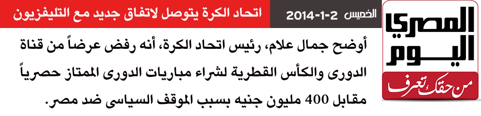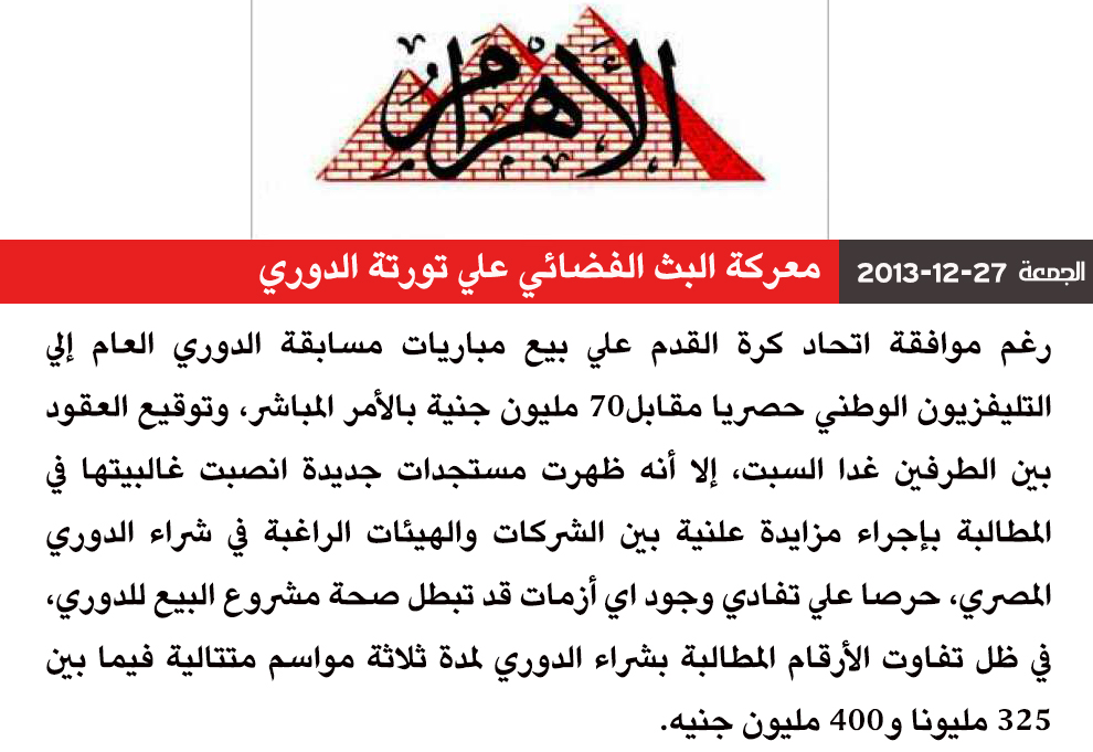 كما وُقع مساء الأربعاء، تعاقدًا يقضي بحصول التليفزيون على حق بث مباريات بطولة الدوري العام لكرة القدم، بين الجبلاية وماسبيرو في حضور وزير رياضة حكومة الانقلاب “طاهر أبو زيد” ووزيرة إعلام الانقلاب “درية شرف الدين” ورئيس اتحاد الكرة “جمال علام” و “عصام الأمير” رئيس اتحاد الإذاعة والتلفزيون. ومع أن ماسبيرو مدين لاتحاد الكرة بمبلغ 44 مليون جنيه من المواسم السابقة لم يتمكن من سدادها حتى الآن ولكن الحكومة تصر على التجارة الخاسرة دائمًا. وعن حقيقة الأمر الذي جعل الحكومة ترفض عرض القناة “القطرية”، أن الحكومة الانقلابية -التي تعهدت مرارًا وتكرارًا بإبعاد السياسية عن الكرة- رفضت هذا العرض بسبب الخلاف السياسي مع دولة قطر وفقًا لما أوردته صحيفة “المصري اليوم” على لسان «جمال علام» رئيس الاتحاد.