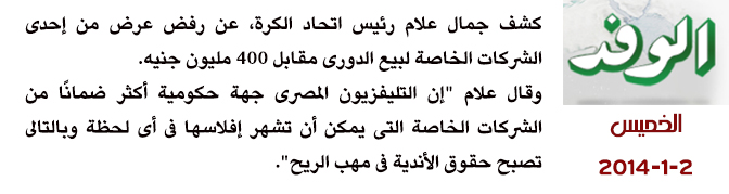 في فضيحة جديدة لحكومة الانقلاب العسكري والفساد المالي الذي أصبح فاضحًا، تكشف شبكة رصد الإخبارية عن إهدار الحكومة للمال العام في الصفقة الأخيرة بين التلفزيون المصري واتحاد الكرة المصري. ووافق اتحاد كرة القدم علي بيع مباريات مسابقة الدوري العام إلي التليفزيون المصري حصرًا مقابل‏70‏ مليون جنيه بالأمر المباشر دون إجراء مزايدة علنية على حقوق البث التي تراوحت العروض المقدمة للحصول عليها ما بين 300 مليون إلى 400 مليون جنيه، من بينها عرض قناة الدوري والكأس القطرية التي عرضت مبلغ 400 مليون جنيه للحصول على حقوق البث، إلا أن الاتحاد رفض هذا العرض حيث صرح «جمال علام» رئيس مجلس إدارته قائلاً:”إن التليفزيون المصري جهة حكومية أكثر ضمانًا من الشركات الخاصة التي يمكن أن تشهر إفلاسها في أي لحظة وبالتالي تصبح حقوق الأندية في مهب الريح” وفقًا لجريدة الوفد.