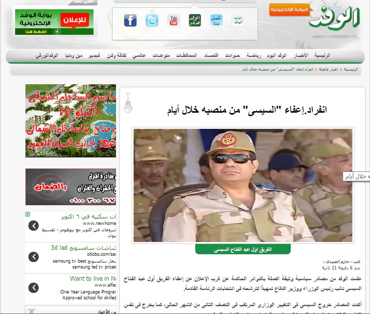 بينما قالت صحيفة الوفد على موقعها:"علمت الوفد من مصادر سياسية وثيقة الصلة بالدوائر الحاكمة عن قرب الإعلان عن إعفاء الفريق أول عبد الفتاح السيسى نائب رئيس الوزراء ووزير الدفاع تمهيدًا لترشحه فى انتخابات الرئاسة القادمة".