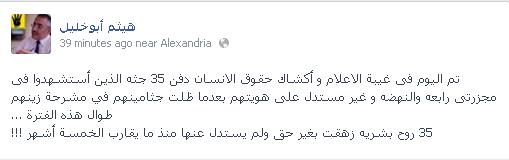 وكتب أبو خليل على صفحته الشخصية على موقع التواصل الإجتماعي "فيس بوك": " تم اليوم فى غيبة الاعلام و أكشاك حقوق الانسان دفن 35 جثه الذين أستشهدوا فى مجزرتى رابعه والنهضه و غير مستدل على هويتهم بعدما ظلت جثامينهم في مشرحة زينهم طوال هذه الفترة , 35 روح بشريه زهقت بغير حق ولم يستدل عنها منذ ما يقارب الخمسة أشهر !!!".