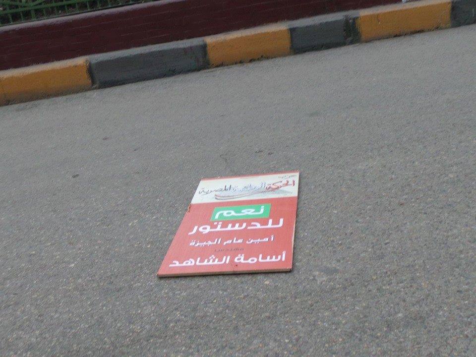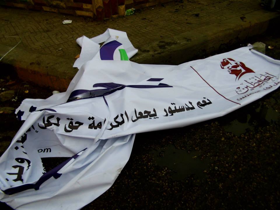 وقام المشاركون بتقطيع اللافتات الموجودة بالشارع الؤيدة لدستور الإنقلاب، وإلقاءها فى الشارع وسط هتافات من المحتجين .