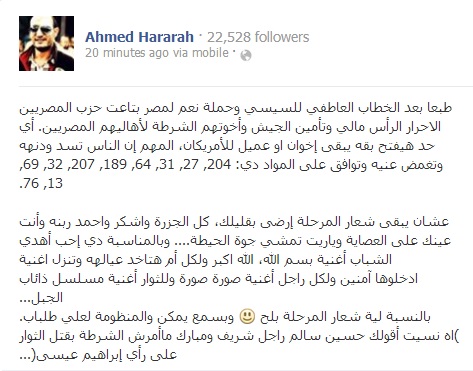 وأضاف عبر حسابه الرسمي على موقع التواصل الاجتماعي فيس بوك: "المهم إن الناس تسد ودنها وتغمض عنيها وتوافق على المواد دي: 204, 27, 31, 64, 189, 207, 32, 69, 76."