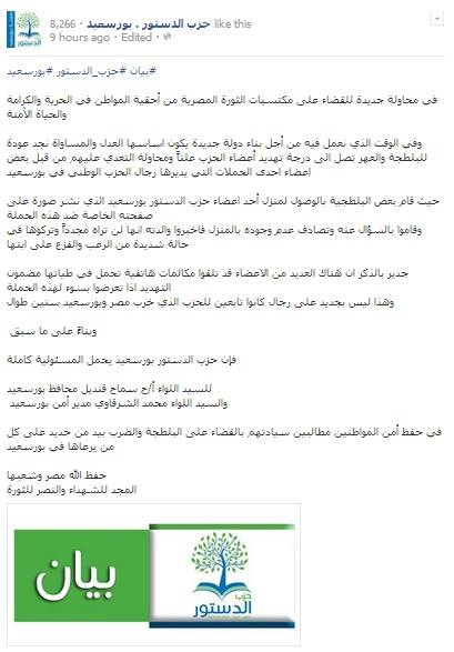 استنكر حزب الدستور ببورسعيد ما اسموه عودة البلطجة تهديد أعضاءه ومحاولة التعدي عليهم من قبل بعض أعضاء إحدى الحملات التي يديرها رجال الحزب الوطني المنحل في بورسعيد و تدعي "مستقبل وطن" .