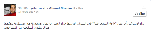 وقال غانم عبر موقع التواصل الاجتماعي – فيس بوك – : "يراد لإسرائيل أن تظل "واحة الديمقراطية" في الشرق الأوسط ويراد لمصر أن تظل جمهورية موز عسكرية يحكمها جنرال يتلقى أسلحته من البنتاجون".