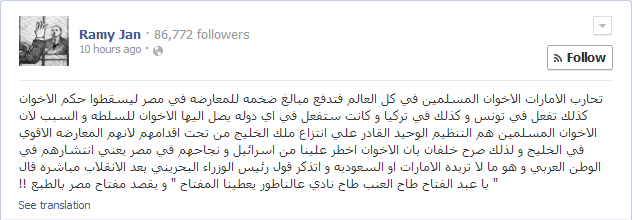 ذكر رامي جان الصحفي ومؤسس حركة مسيحيون ضد الانقلاب أن دولة الإمارات تحارب الإخوان المسلمين في كل دول العالم، وتدفع مبالغ ضخمة للمعارضة في مصر؛ حتى يسقطوا حكم الإخوان، وأكد أنها تفعل ذلك في تونس وتركيا، وستفعل ذلك في أي دولة يصل الإخوان فيها للسلطة.